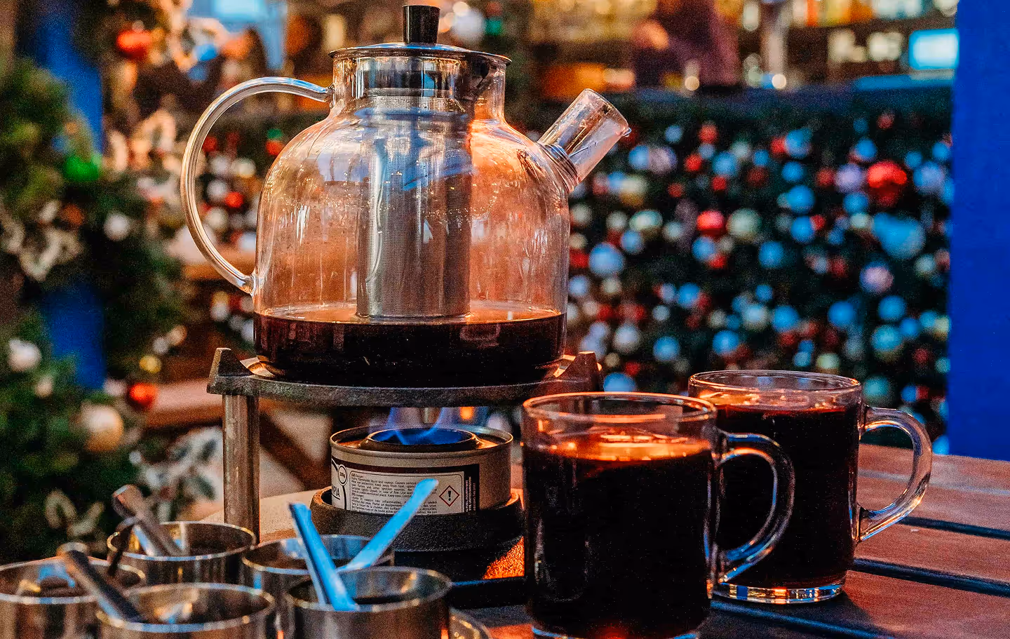 The Instagramable teapots come with a heater to keep the mulled wine warm.